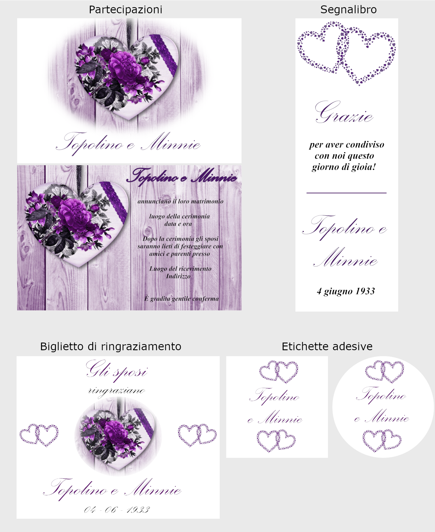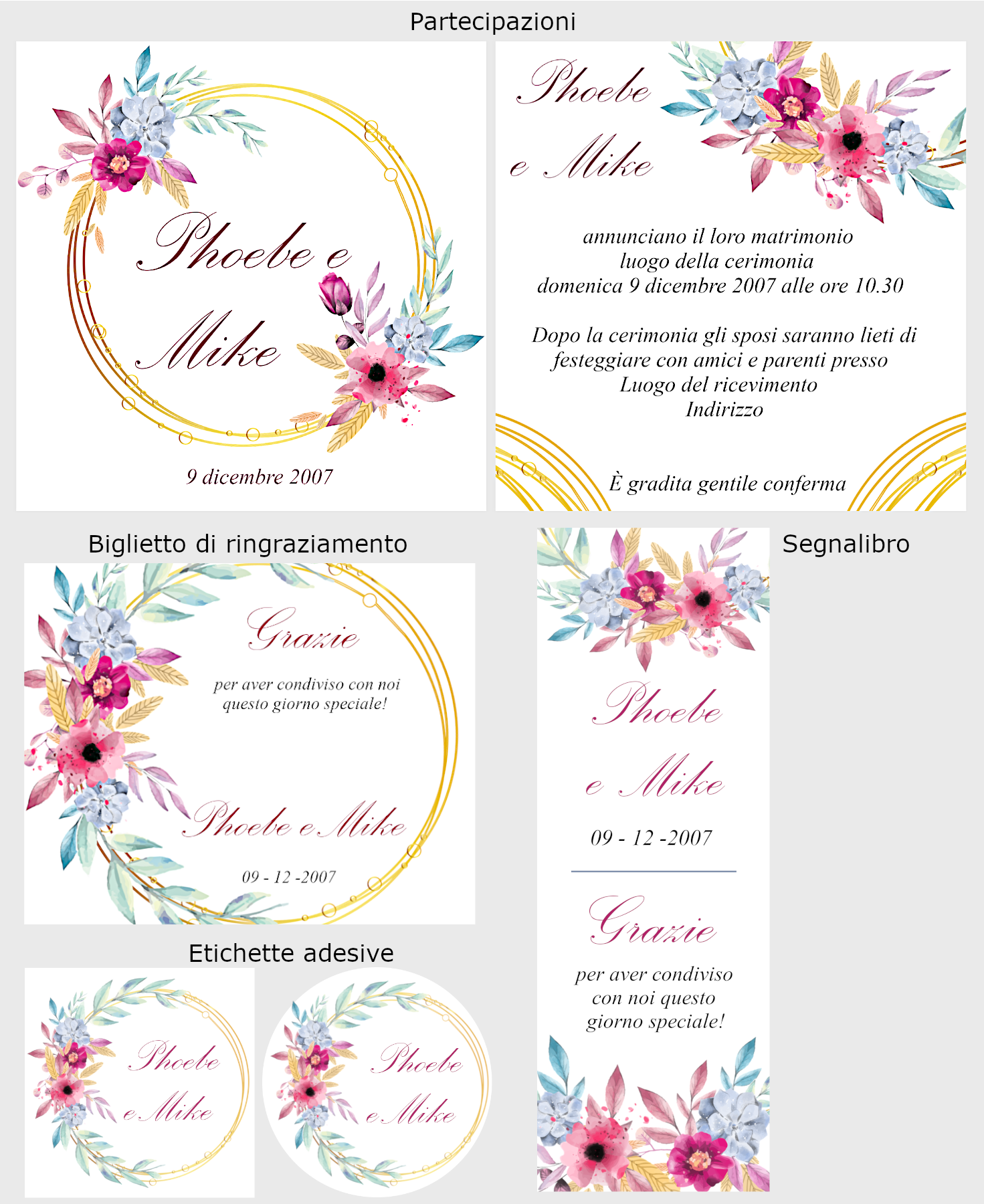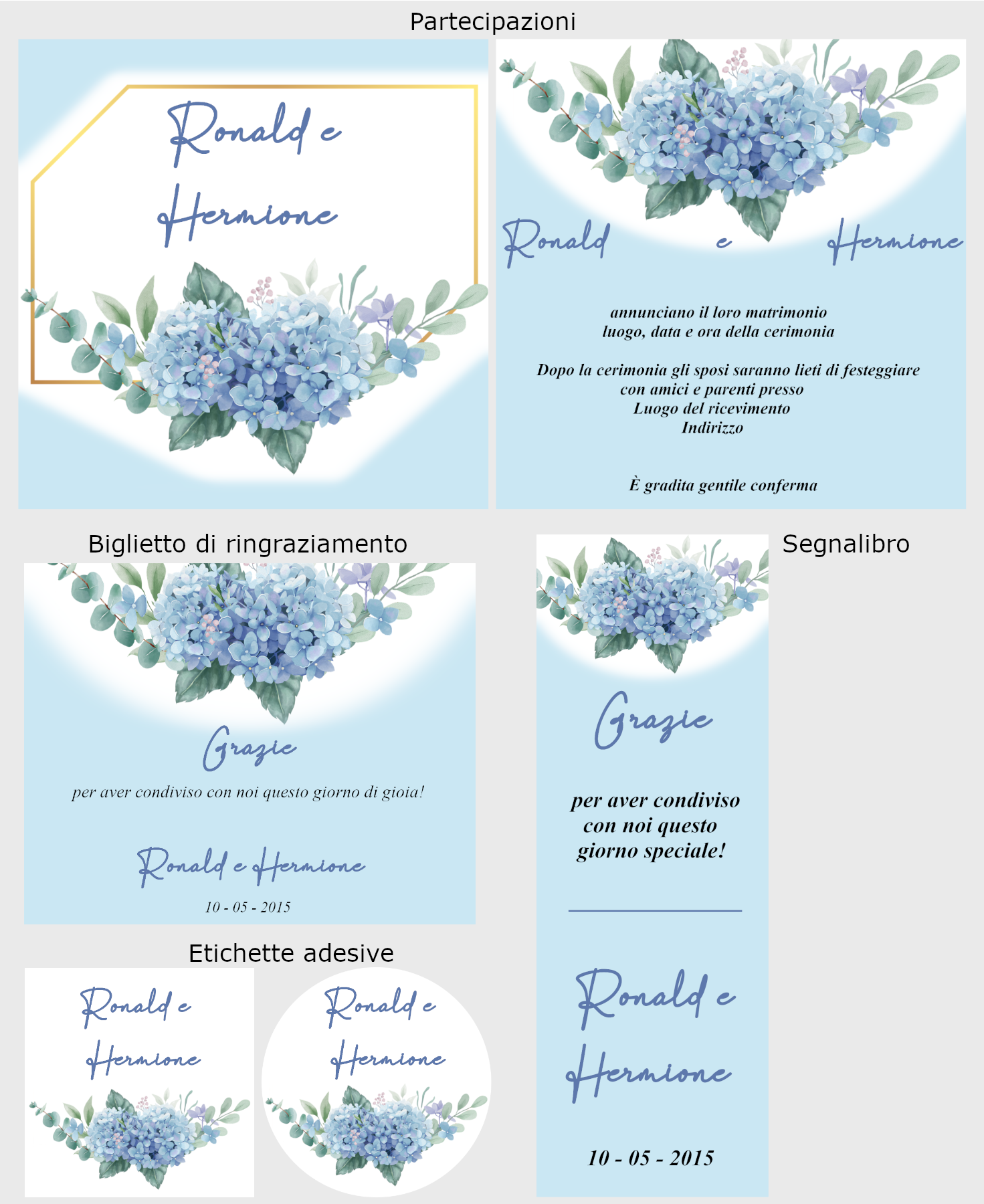 - il testo da inserire (nomi degli sposi, luogo della cerimonia e del ricevimento, date ed orari, eventuali modifiche al testo)