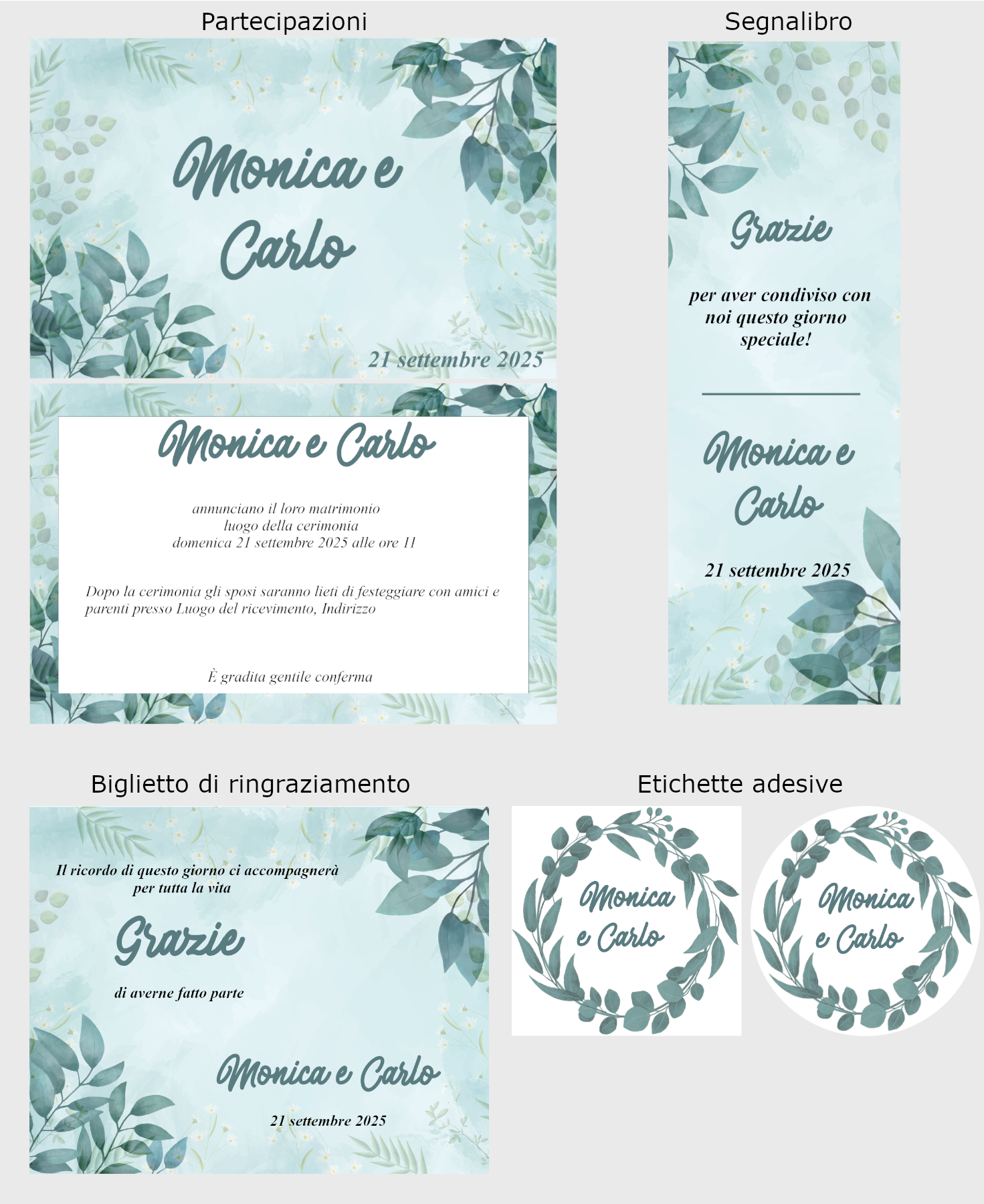 Per il tuo matrimonio, offriamo una vasta scelta di impostazioni grafiche e accessori per accontentare i tuoi desideri: è infatti possibile coordinare diversi prodotti per rendere questo giorno ancora più speciale!