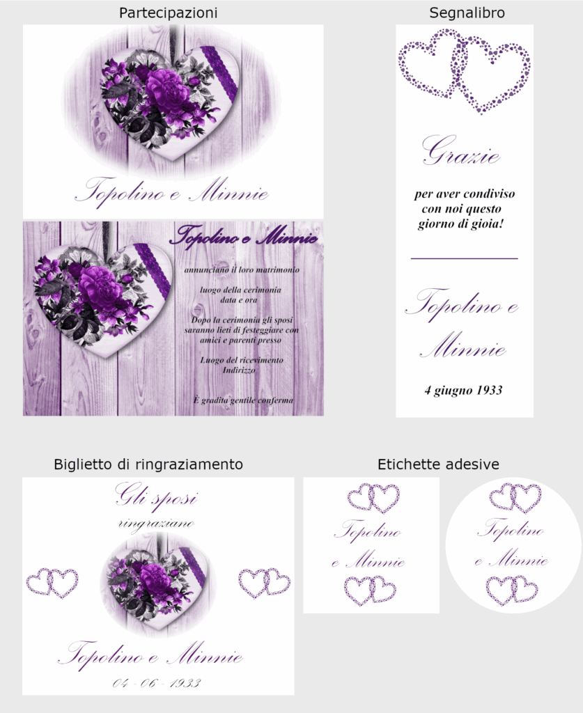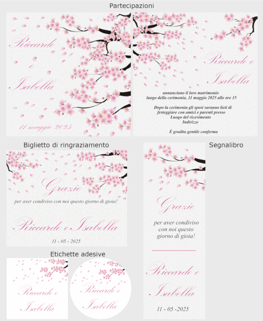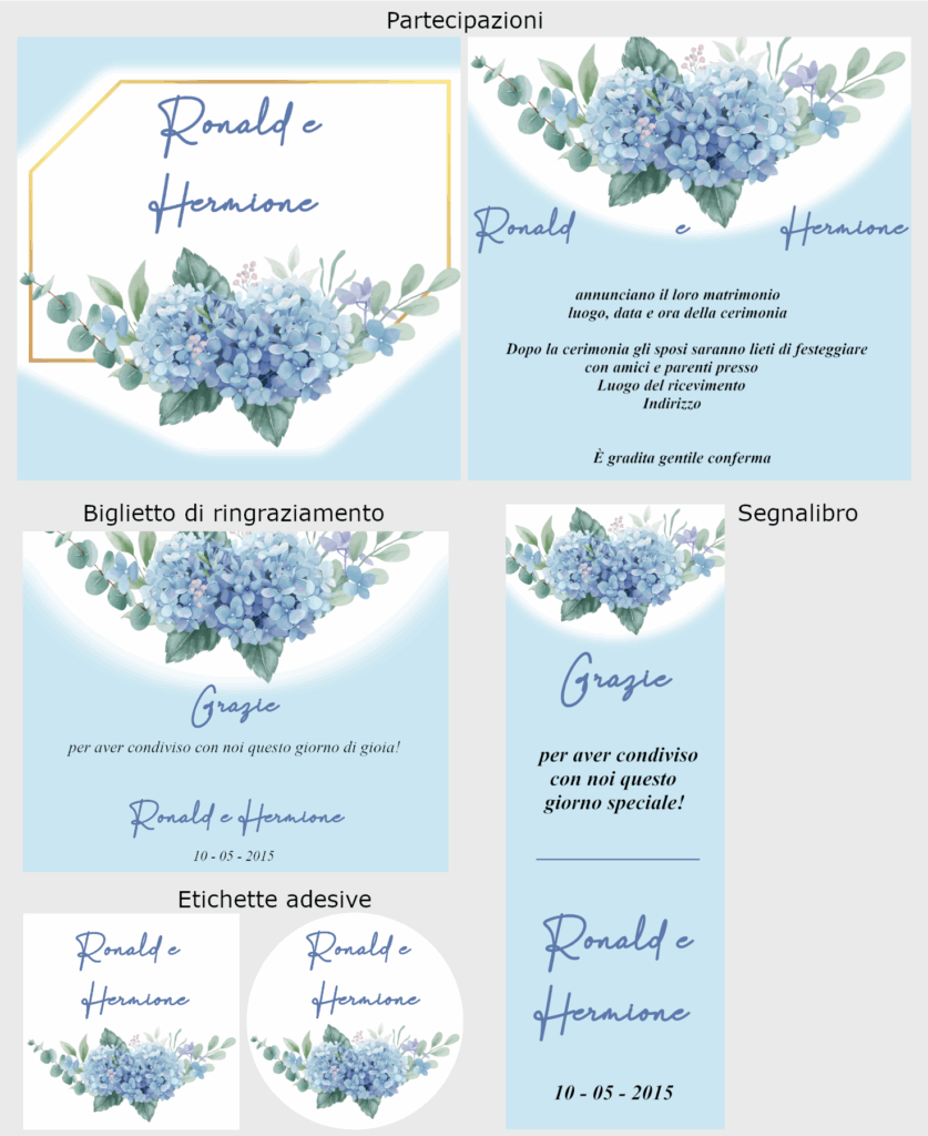 - il testo da inserire (nomi degli sposi, luogo della cerimonia e del ricevimento, date ed orari, eventuali modifiche al testo)