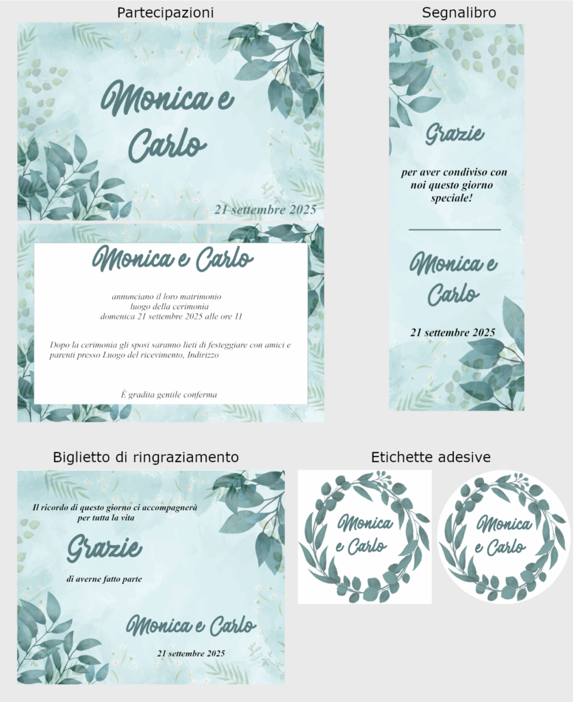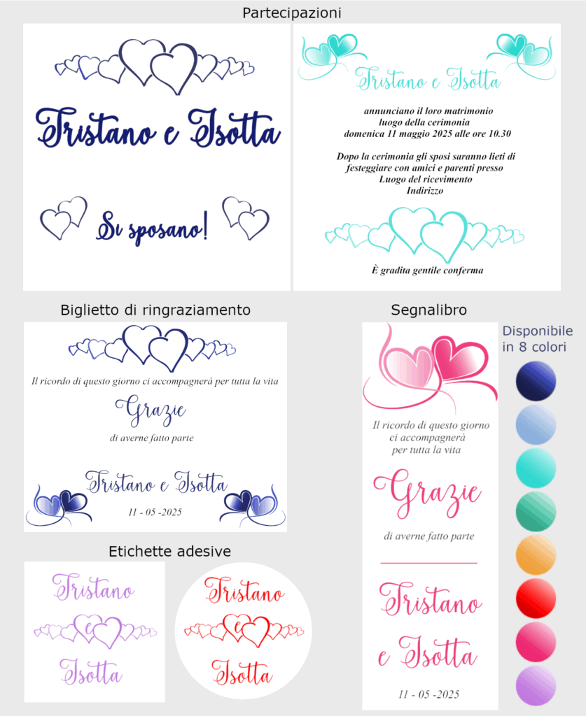 Per il tuo matrimonio, offriamo una vasta scelta di impostazioni grafiche e accessori per accontentare i tuoi desideri: è infatti possibile coordinare diversi prodotti per rendere questo giorno ancora più speciale!